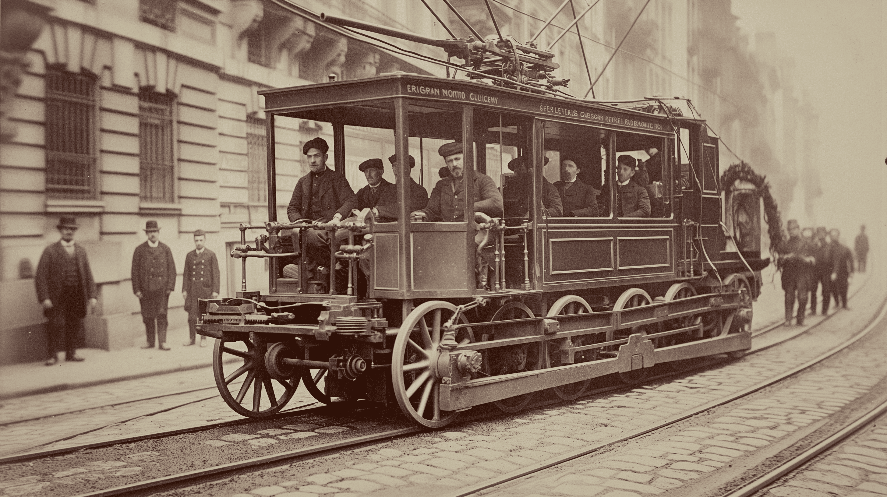 В 1881 году был изготовлен первый трамвай. Двигался он по рельсам, построенным для конных экипажей, но работал от электрического тока, который шел по кабелям, протянутым над старыми маршрутами. Электрический ток к электроавтобусу подавался через специальное устройство, похожее на руку. Железные рельсы и колеса служили заземлением, чтобы пассажиров не поразило током.