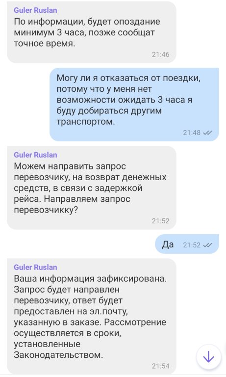 Запрос на возврат средств сейчас находится на рассмотрении перевозчика.